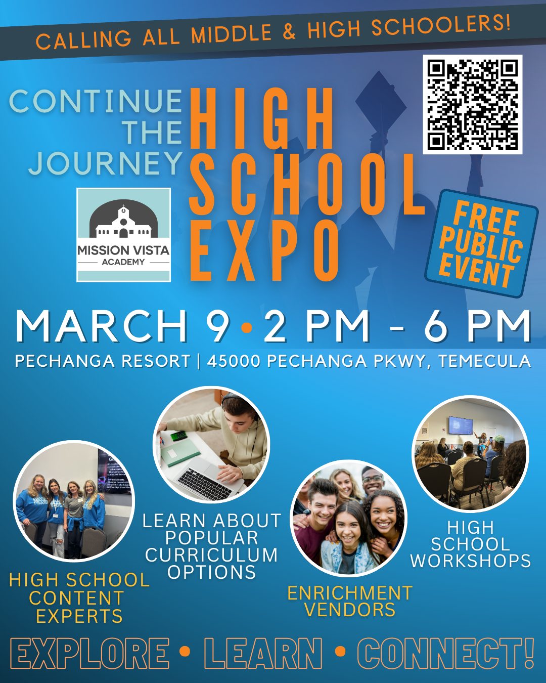 Mission Vista Academy invites you to our annual High School Expo! This is a free, in-person event open to all Middle School and High School Students/Families.