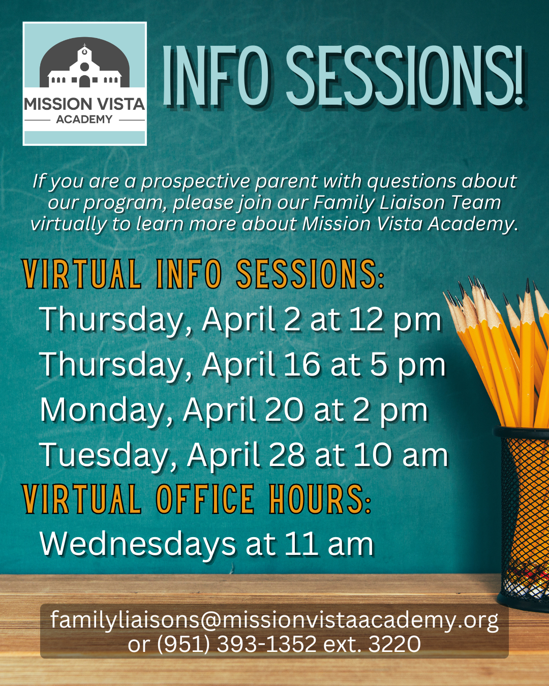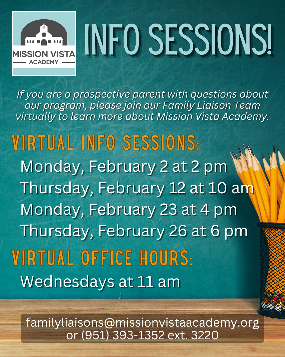 TK-8 & High School Program: If you are a prospective parent and have questions about our program, please contact our Family Liaison Team at familyliaisons@missionvistaacademy.org or (951) 393-1352 ext. 3220